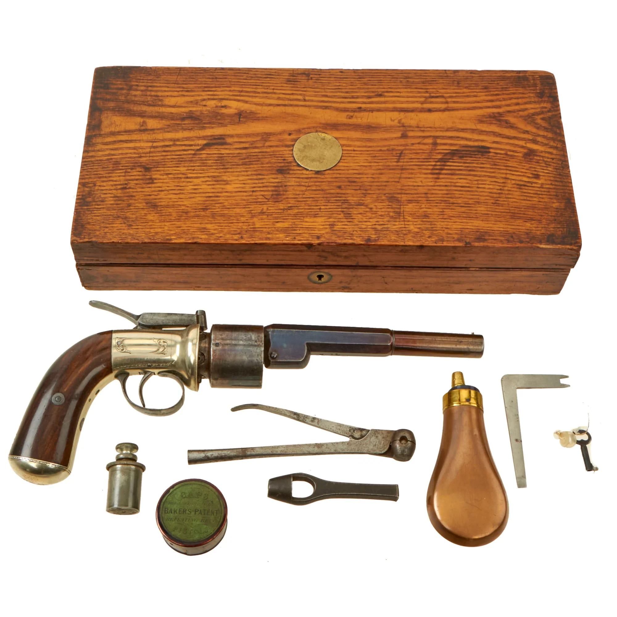 Original Item: Only One Available. This is a lovely example of a rare Baker’s Patent Nickel Silver Framed percussion revolver, complete with a fantastic custom case an accessories. Thomas Kerslake Baker was a gunmaker in Victorian England, and worked out of 88 Fleet Street in London. He is most known for is 1852 Patent of a “Longspur” cocking handle for single action revolvers, which did achieve some popularity at the time. Not only did it allow easy cocking of the revolver, it also has a cutout in the left side as well as a slight offset to the right, with a notch sight at the bottom of the cutout. This allowed accurate sighting of the revolver, something often not possible with this design of revolver.