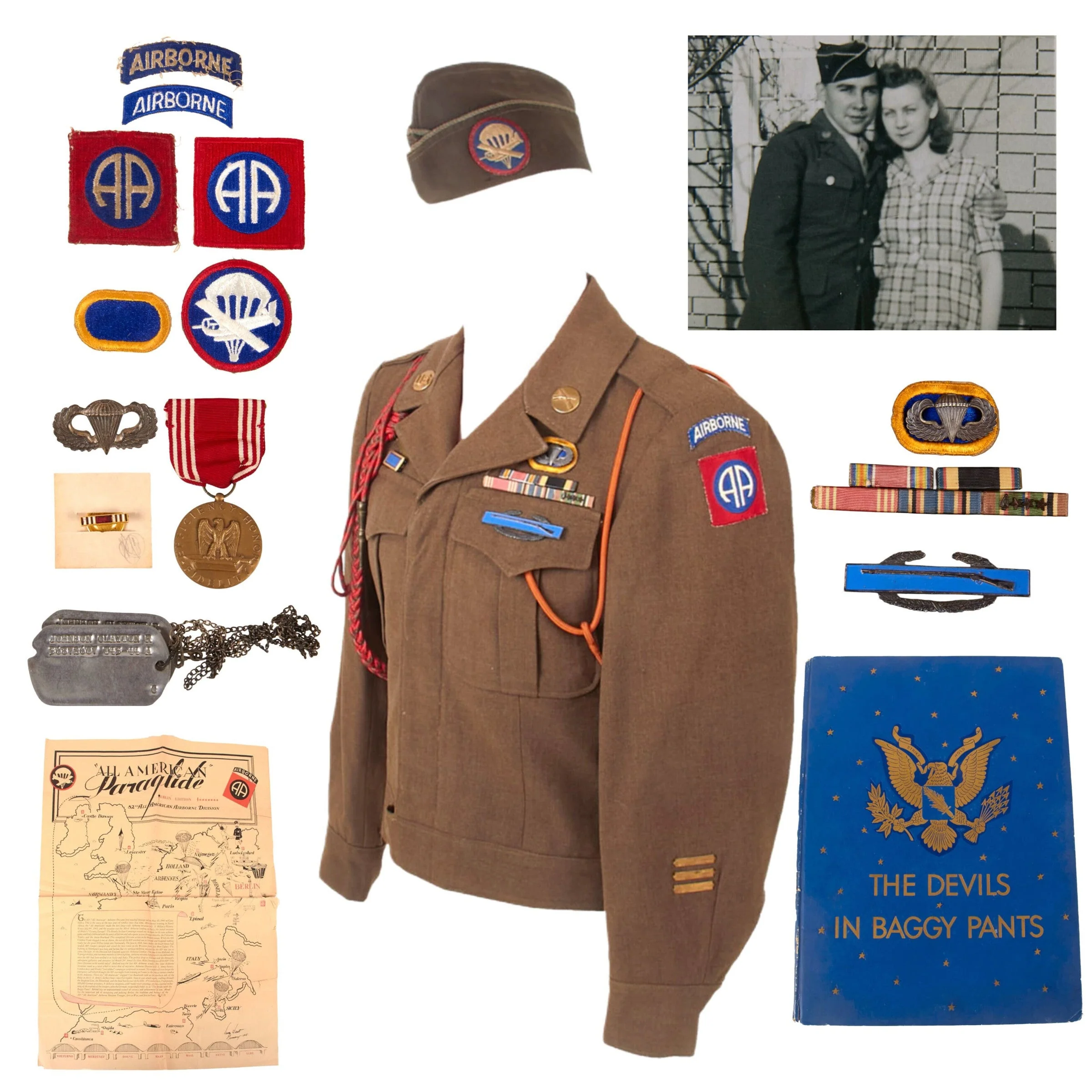 Original U.S. WWII 504th PIR 82nd Airborne Uniform Grouping with Dog Tags, Garrison Cap, and “Devil in Baggy Pants” Unit History – Clayton R. Johnson